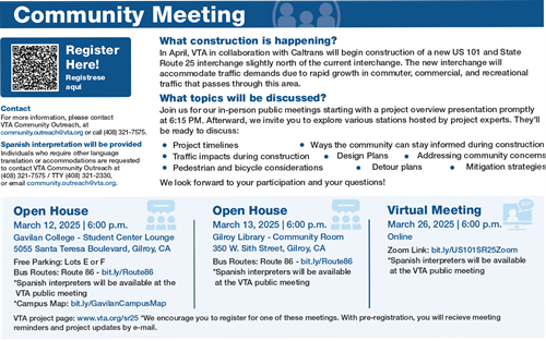 We invite you to an important community meeting hosted by the Santa Clara Valley Transportation Authority (VTA). This is a vital opportunity to learn about the upcoming US 101/25 ramp and overpass construction and how it will affect traffic to our Gilroy campus. Your participation will help us all navigate these changes together.