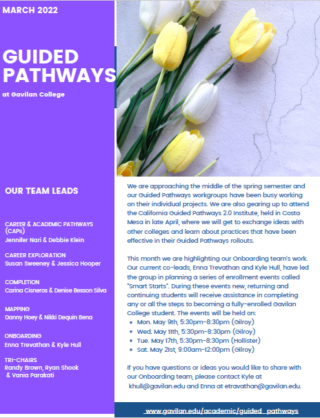 This month we are highlighting our Onboarding team's work. Our current co-leads, Enna Trevathan and Kyle Hull, have led the group in planning a series of enrollment events called "Smart Starts". During these events new, returning and continuing students will receive assistance in completing any or all the steps to becoming a fully-enrolled Gavilan College student. The events will be held on: