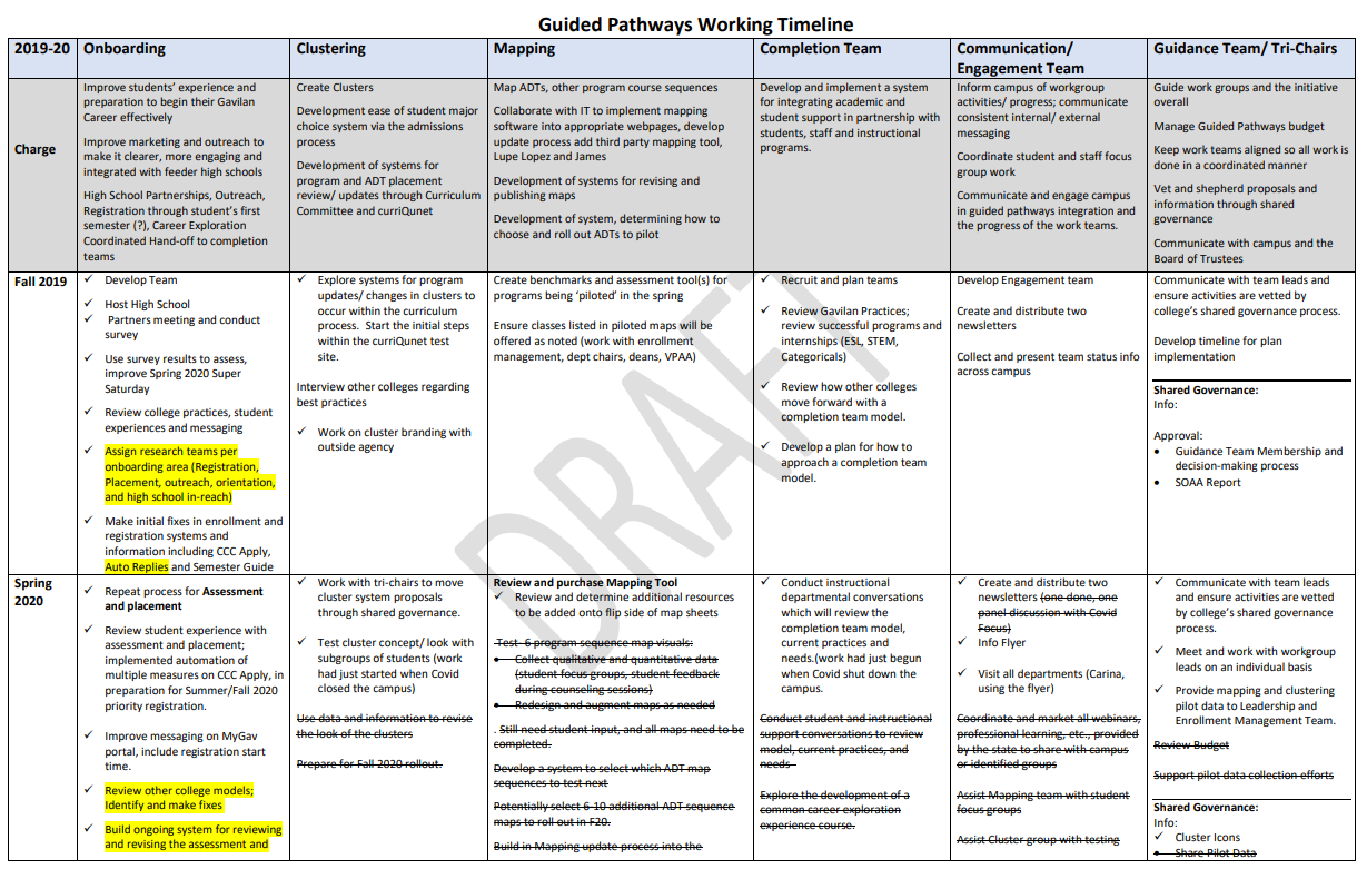 View what the campus is doing Guided Pathways Timeline Draft and how we are parsing things out
