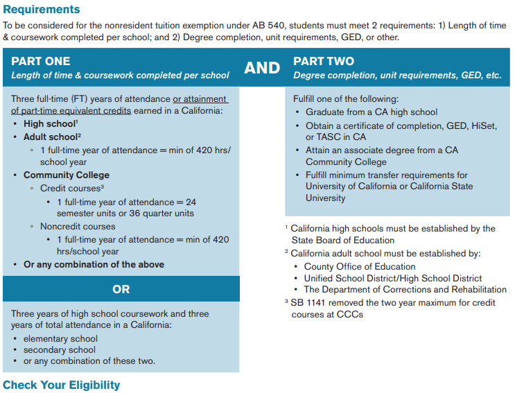 AB 540 (expanded by SB 68 & SB 1141) enables students to count years spent at a California Community College (CCC) and adult school towards eligibility for in-state tuition. Additionally, the completion of an associate degree or satisfaction of the minimum requirements to transfer to the University of California (UC) or California State University (CSU) will meet the degree or unit requirements. SB 1141 removed the two-year limit of credits from the California Community Colleges (CCC). These new eligibility criteria expanded possibilities for students educated in CA to qualify for in-state tuition and state based financial aid at CCCs, CSUs, and UCs.