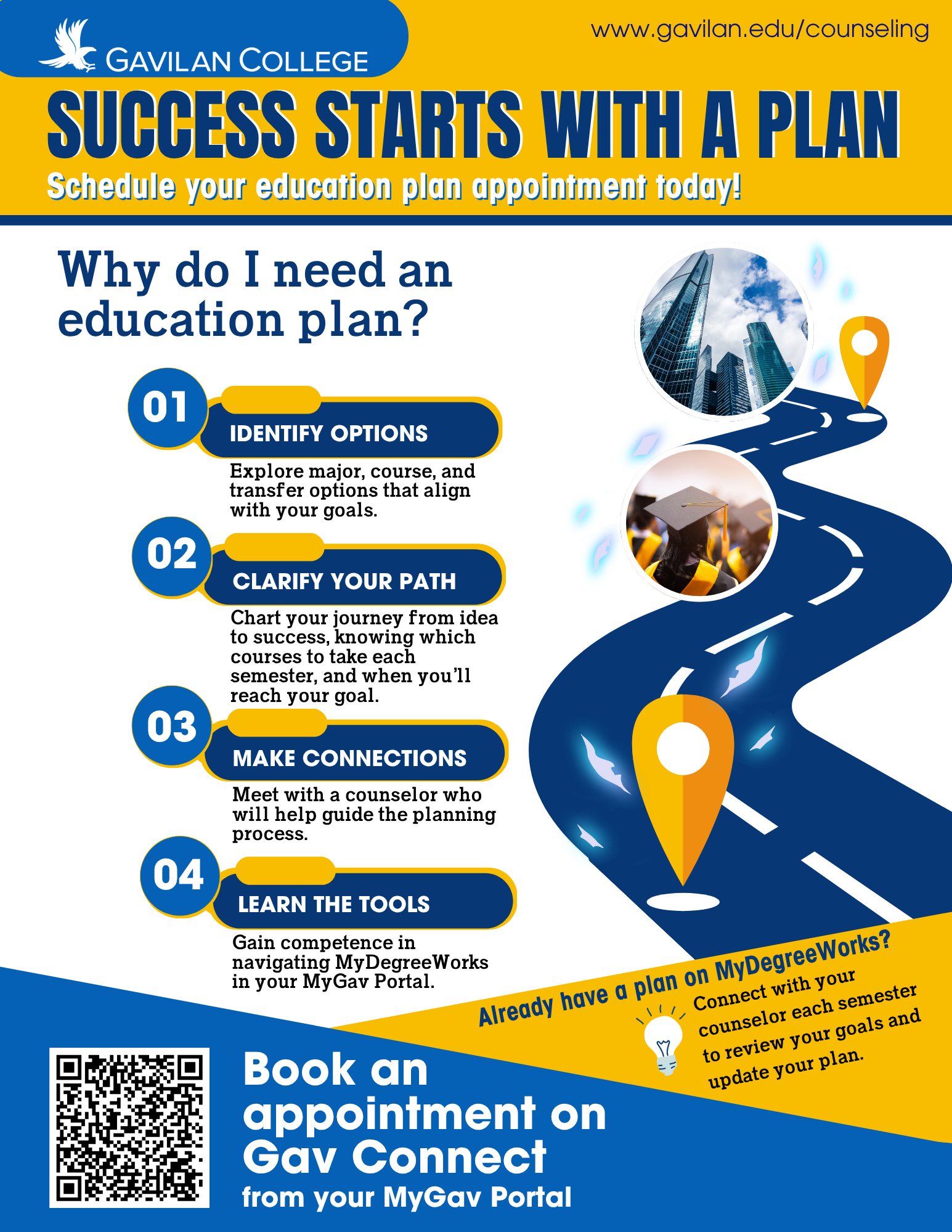 IMPORTANT: An education plan requires a scheduled appointment with a counselor. Schedule your appointment using Gav Connect.