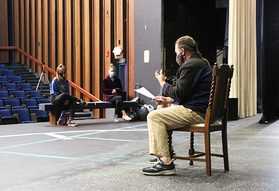 Three video cameras are positioned four rows up in the audience seats, and the actors have moved much of the action to the front of the stage. “Our voices are muffled because of the masks,” sais Gilbert.