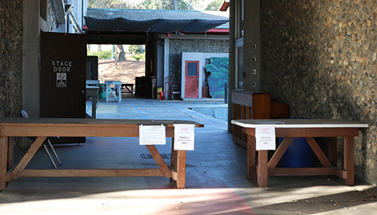 For classes and rehearsals, students must enter the college theater through the stage door.
