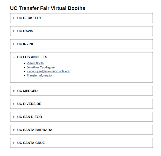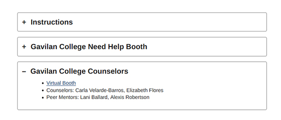 Working with college webmaster Karl Sachtleben, the Gavilan Transfer Committee created a virtual cafeteria of features. Students could register online, navigate a list of instructions, expand drop downs explaining all the features, and link to live engagement with the recruiters.