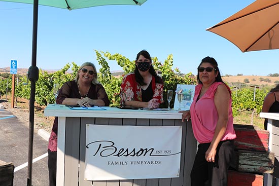 Denise Besson, center, with family friends Veena and Sai Gundavelli (left) and her parents George and Martha Besson (right), welcomed guests as they entered the vineyard. The Besson family has produced wine grapes for area wineries since 1925. Denise Besson recently repositioned the family business to bottle the grapes under the family name, Besson Family Vineyards.