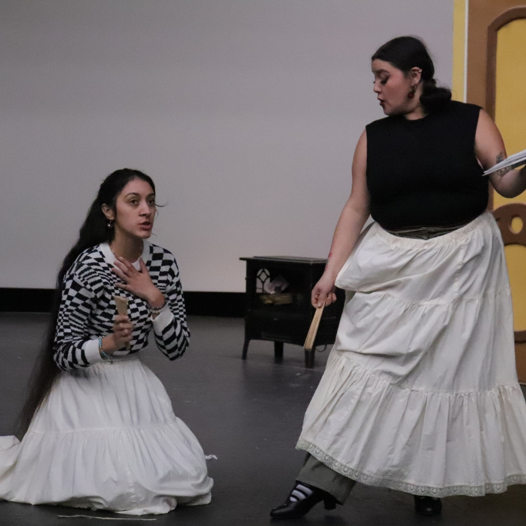 Actresses Kassandra Zarate (Dona Ana) and Eliz Hatcher-Santiago (Dona Leonor) rehearse a scene from House of Desires.