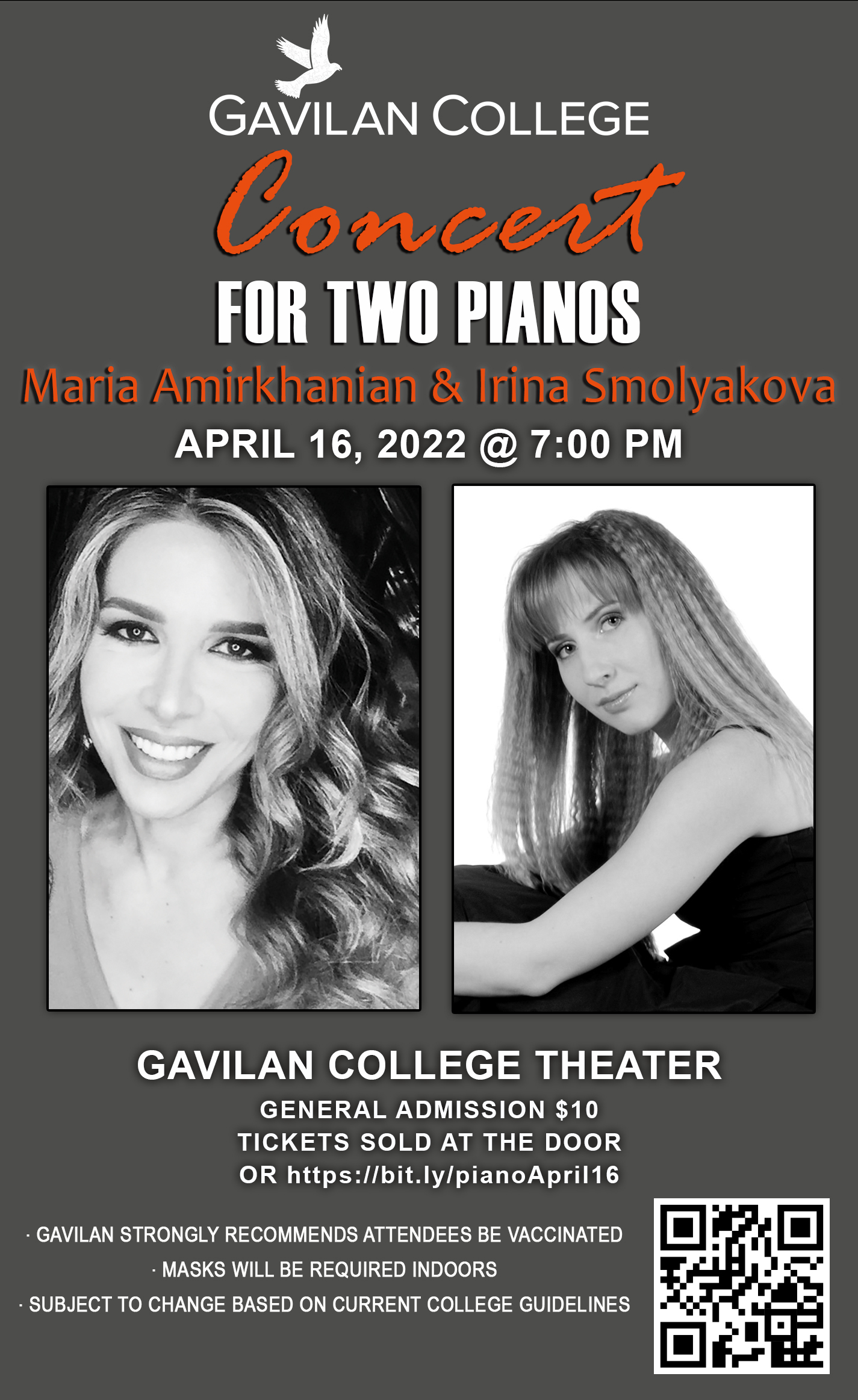 by on Apr 1, 2022GILROY, CA – On Saturday, April 16 @ 7:00 PM the Gavilan College Music Program is proud to present a Concert for Two Pianos, featuring music faculty member, Dr. Maria Amirkhanian, and former alumni, Irina Smolyakova. The concert will be held in the Gavilan College Theater. The program will include works by Borodin, Bizet, and Brubeck.