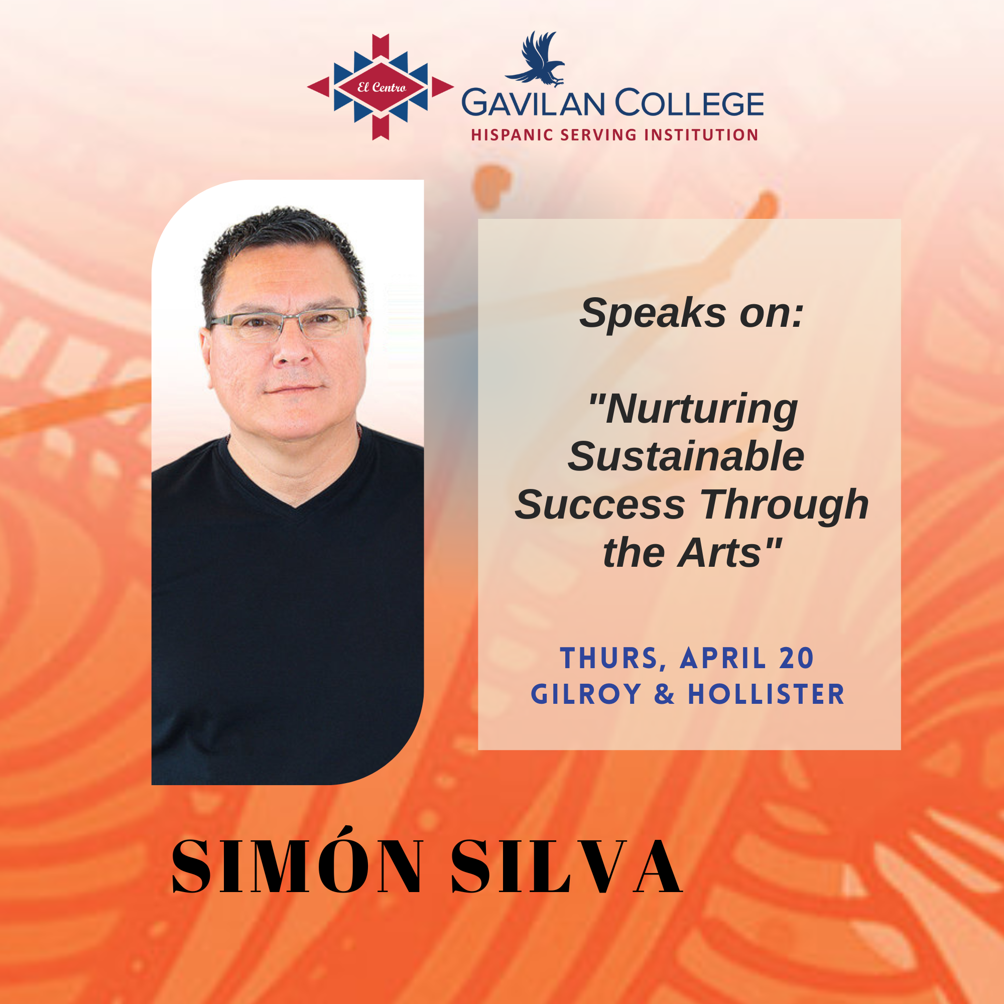 Hosted by Gavilan’s El Centro, Mr. Silva will provide the following lecture, “Nurturing Sustainable Success Through the Arts,” and workshop at the following locations and start times: