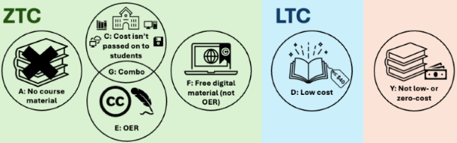 There are seven different codes which correspond to varying costs to students and copyright and licensing statuses.