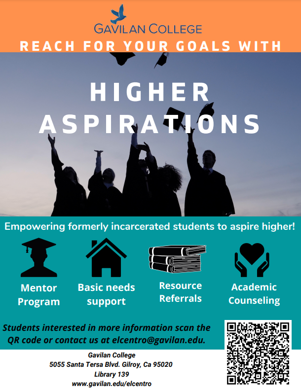 At Gavilan College, we believe that all students should have the opportunity to pursue a higher education despite their past experiences. We want to support you with earning your degree. Higher Aspirations is a program designed for and together with students and staff affected by incarceration. The program is geared toward the successful entry and completion of formerly incarcerated students.