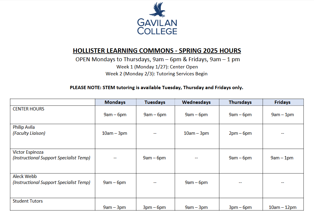 Founded in 2017, Gavilan's STEM Center provides a centrally located space for STEM students to meet, study, and bu ild community. T textbooks , technology, and other supplies are available for in room use or semester loan. F faculty, staff, and trained peer tutors are available to academically support student success in Math, Physics, Biology, Chemistry , and Computer Science courses.