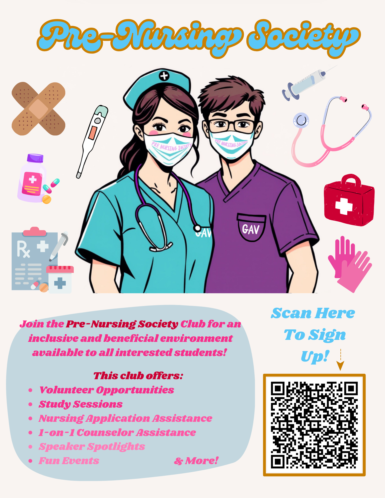 The Pre-Nursing Society provides guidance and assistance for students interested in healthcare through study sessions, volunteer opportunities, essential information, speaker spotlights, and much more to succeed in their college and career aspirations.