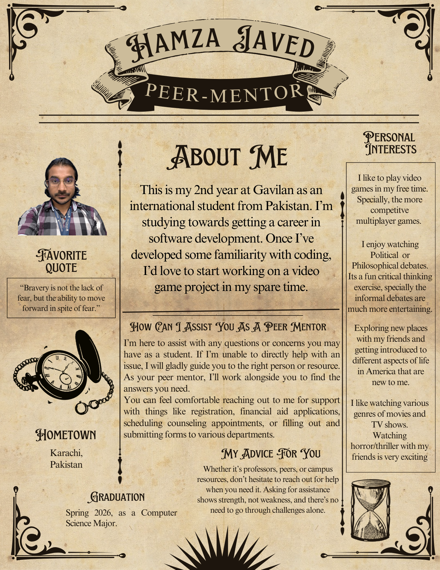 The mission of the Gavilan College Peer Mentor Program is to assist all students reach their academic and personal goals. The goal of the peer mentor is to deliver effective and efficient one-to-one support to all students by providing information, referrals, and resources about Admissions and Records, Financial Aid, Counseling, and other support programs.