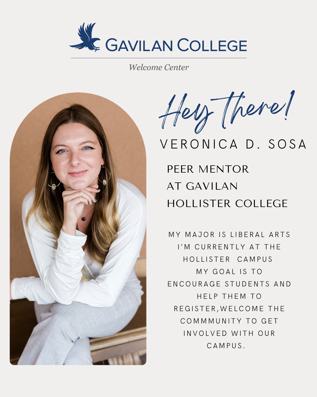 The Welcome Center is here to assist all students with general information about Admissions & Records, Financial Aid, Counseling, and campus support programs and services. Knowledgeable Peer Mentors staff the center and provide access to computers, printing required documents, and mentoring new and current students at Gavilan College. The peer mentors offer one-on-one support to all prospective, current, and returning college students. This support can be answering questions or providing social and academic support to ease the transition to college. Email Michele Castro here to connect with a mentor and become a part of this program.