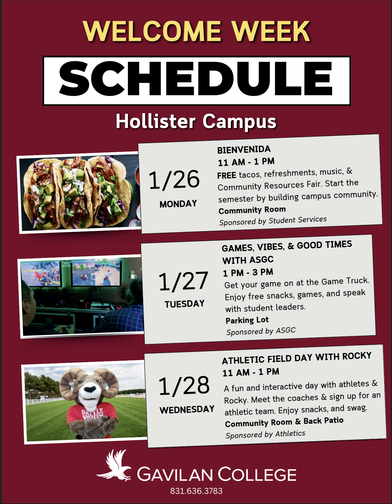 Welcome Week is your chance to kick off the semester with food, fun, and new connections. Whether you're in Gilroy or Hollister, join us for tacos, games with Rocky the Ram, and a sweet treat from ASGC. These events are designed to bring students together and celebrate the start of the year.